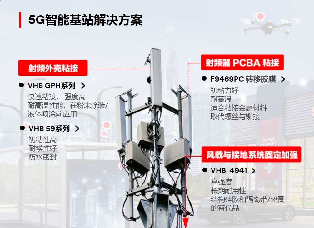 除了厚的VHB™, 還有100MP膠系的薄型雙面膠帶也應用在5G天線與基站中。5G射頻器內(nèi)PCBA粘接至金屬面板, 使用 F9469PC轉(zhuǎn)移膠膜,是透明的純膠膜雙面膠,初粘力好,厚度0.125mm,長期耐溫149°C,短期耐溫260°C,適合粘接金屬材料, 具有極高的剝離強度,具有優(yōu)異的穩(wěn)定性和高粘接性能。